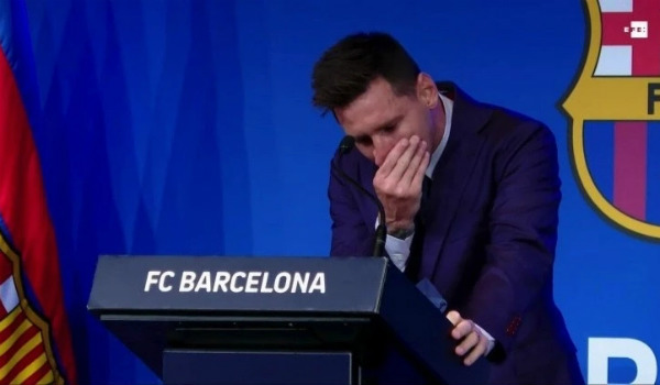 步入会场后还未开始发言,难以抑制情绪的梅西已经哽咽落泪。