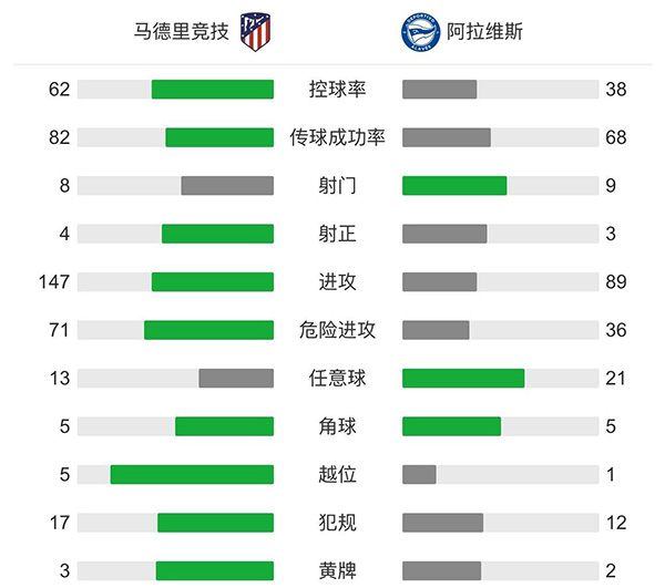 全场比赛结束,马德里竞技1-0阿拉维斯。