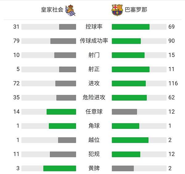 比赛第78分钟,皇家社会扳回一球。费尔南德斯插上得球横传,巴雷内切亚接球领到了禁区中路线上射门得分。皇家社会1-5巴萨。