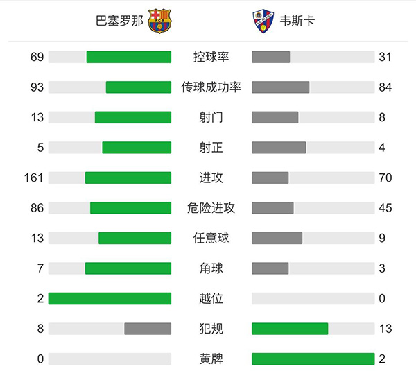 全场比赛结束,巴萨4-1战胜韦斯卡,迎来联赛四连胜。