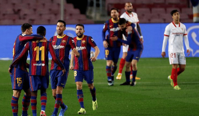 来源:24直播网03-04 19:4824直播网3月4日讯 国王杯半决赛次回合巴萨上演神奇逆转,他们在主场通过加时赛以3-0击败塞维利亚,总分3-2逆转对手,挺进到了本赛季国王杯决赛。这场比赛巴萨赢得非常惊险,登贝莱早早取得进球,但塞维利亚获得点球,好在特尔施特根神奇扑点成功,如果点球打进的话,巴萨需要再进3球才行。接下来神剧情出现,常规时间内第93分08秒,皮克进球扳平比分,比赛进入到加时赛。加时赛布莱斯维特头球为巴萨反超,巴萨顶住压力,成功晋级到国王杯决赛。