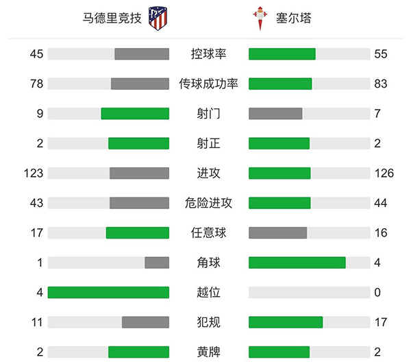 全场比赛结束,马德里竞技2-2塞尔塔。