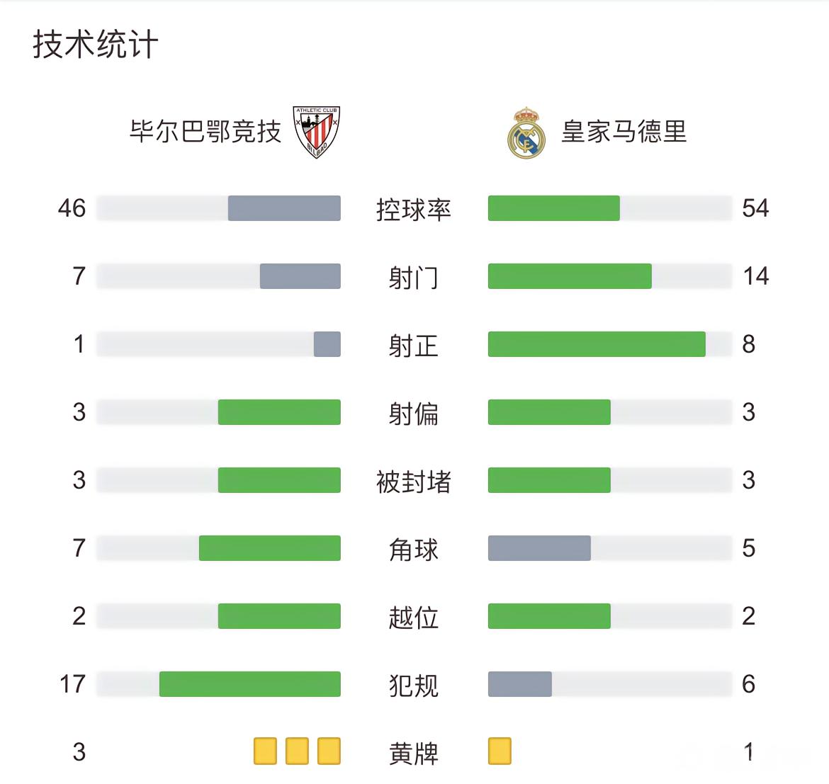 最终全场比赛结束,皇马2-0客胜毕尔巴鄂。