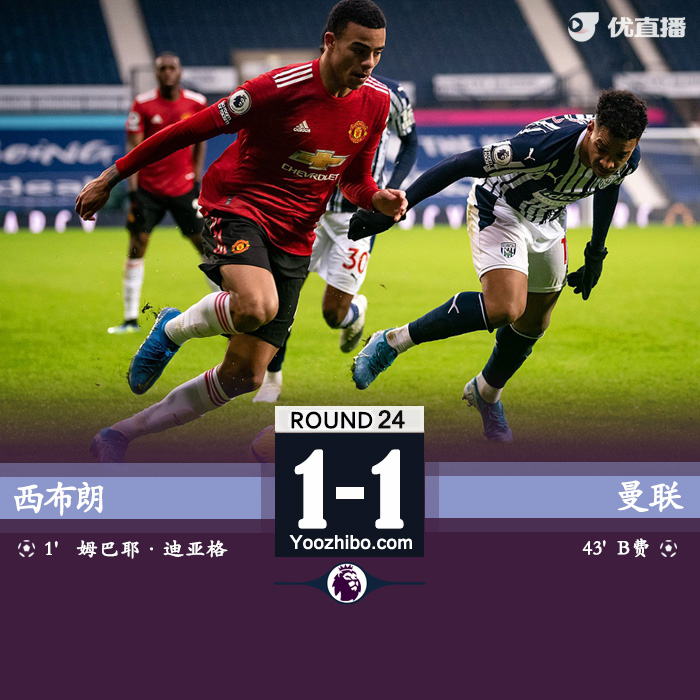 24直播网2月14日讯 北京时间2月14日22点,英超第24轮曼联客场挑战西布朗。上半场,迪亚涅闪击破门,B费在上半场尾声时扳平比分.下半场,西布朗完成门线解围,马奎尔出现失误,德赫亚也扑出迪亚涅的单刀,马奎尔补时阶段头球中柱。全场比赛结束,曼联1-1西布朗。本场比赛过后,曼联积46分以净胜球优势反超莱斯特城排在积分榜第二。