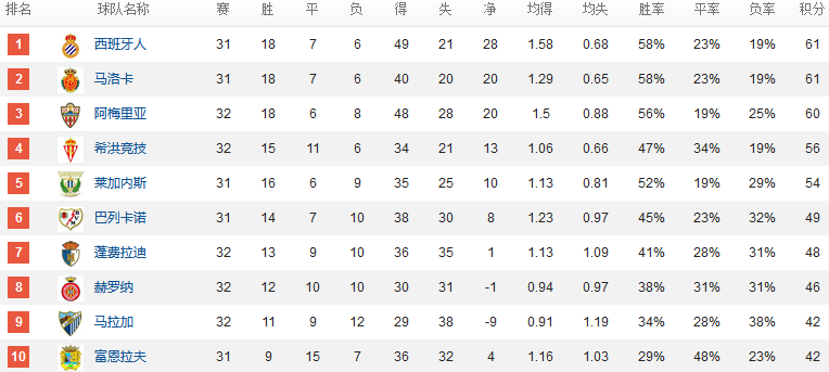 之所以厮杀激烈,原因是本赛季西乙升甲规则与过去不同,不是前三名直接冲甲,而是前两名直接升甲,第三四五六名要在附加赛中决出一个冲甲名额。根据近期状态,马略卡和阿尔梅里亚均出现掉链子的情况,近期一胜难求,进而让西班牙人实现了逆袭,最近两轮比赛,西班牙人从积分榜第三名逆袭连续超越了阿尔梅里亚和马略卡夺回榜首位置。