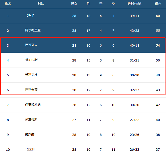 第四名的莱加内斯本轮0-0被卡斯特利翁逼平,放缓了追分脚步,积50分;第五名的希洪竞技2-2被蓬费拉迪纳战平,积48分;第六名的巴列卡诺1-1被拉斯帕尔马斯战平,积43分。六队表现两极分化明显,马略卡和阿尔梅里亚近期高歌猛进,双双大逆袭超越西班牙人垄断积分榜前二名,本赛季的冲甲规则恰好是前两名直接身价,第三四五六附加赛争夺一个冲甲名额。