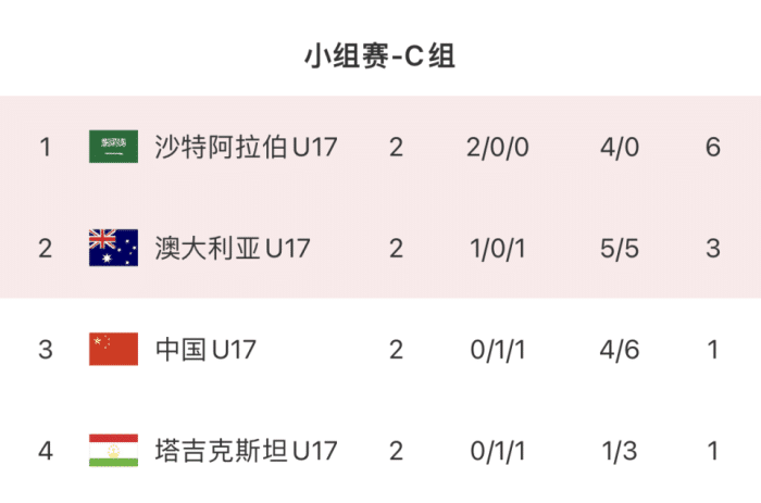 而沙特队小组赛首轮2-0击败了澳大利亚队,第2轮则是2-0击败塔吉克斯坦,2连胜后拿满6分高居小组第1。本场比赛,提前出线的他们只要打平便可锁定头名。澳大利亚则1胜1负积3分排名小组第2,中国队第3,塔吉克斯坦同积1分但因进球数少垫底。
