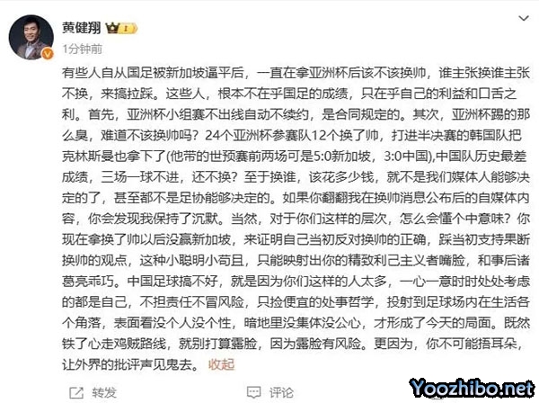 黄健翔:有些人拿亚洲杯后该不该换帅搞拉踩 这些人只在乎利益口舌
