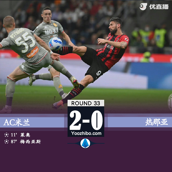 24直播网4月16日讯 北京时间4月16日凌晨3点整,2021-22赛季意甲第33轮在圣西罗球场展开角逐,AC米兰坐镇主场迎战热那亚。上半场卡卢卢助攻,莱奥首开纪录,下半场梅西亚斯替补锁定胜局。最终AC米兰主场2-0战胜热那亚,米兰终结联赛两连平。积分榜方面,米兰多赛一场积71分,领先国米2分重回榜首。