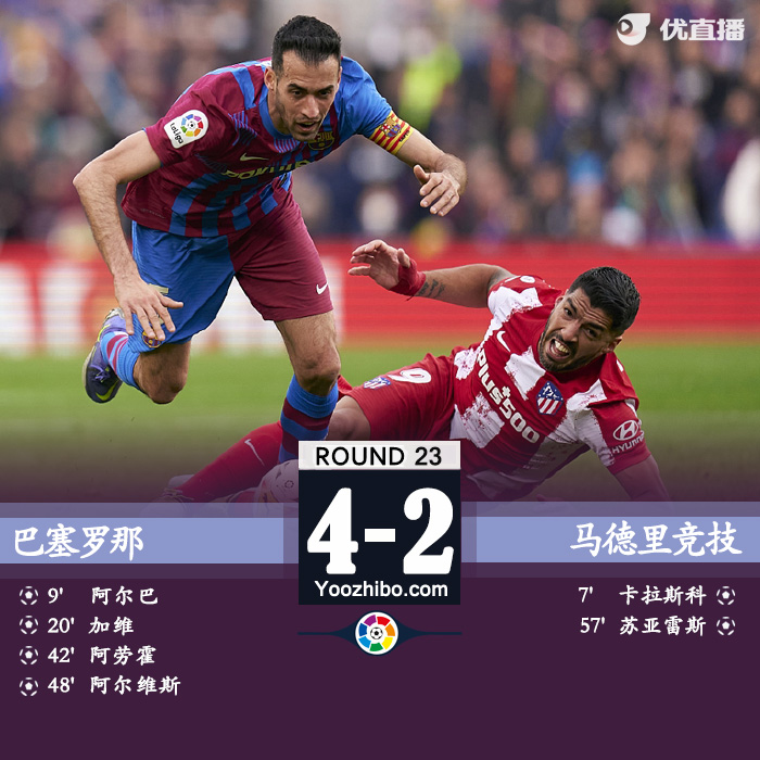 24直播网2月7日讯 北京时间2月6日23:15,西甲联赛第23轮巴萨主场迎战马竞的比赛。上半场卡拉斯科推射破门,阿尔巴凌空世界波扳平,加维头球反超,阿劳霍补射破门,半场巴萨3-1马竞。下半场易边再战,阿尔维斯破门后染红,苏亚雷斯为马竞扳回一球,最终,巴萨4-2马竞。