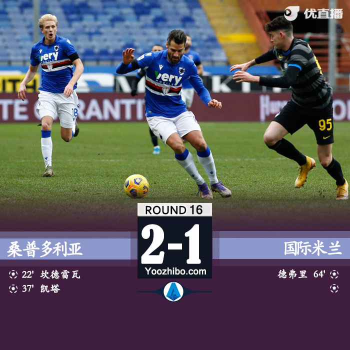 24直播网1月6日讯 北京时间1月6日22:00,意甲联赛第16轮一场比赛在桑普多利亚和国际米兰之间进行。上半场桑切斯点球被扑阿什利扬补射中柱,托内利头球中框坎德雷瓦点球破僵,达姆斯高精彩突破助攻凯塔破门。下半场德弗里扳回一球。最终国米客场1-2不敌桑普联赛八连胜遭终结,在积分榜继续落后AC米兰1分排名次席。