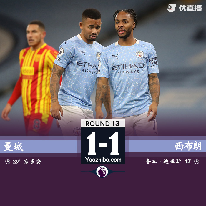 全场比赛结束,曼城最终主场1-1战平西布朗。