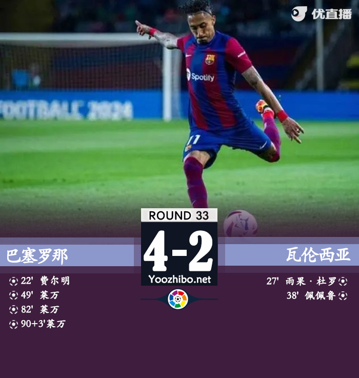 24直播网讯:北京时间3:00西甲第33轮,巴塞罗那主场迎战瓦伦西亚。上半场,费尔明首开记录;特尔施特根挑球过人玩砸送空门;阿劳霍送点;瓦伦门将停球失误+禁区外手球遭罚下,半场巴萨暂时1-2落后。下半场,莱万两次角球中头球梅开二度!比赛最后阶段又任意球直接破门完成帽子戏法!最终,巴萨4-2击败十人瓦伦升至第二,落后榜首11分。