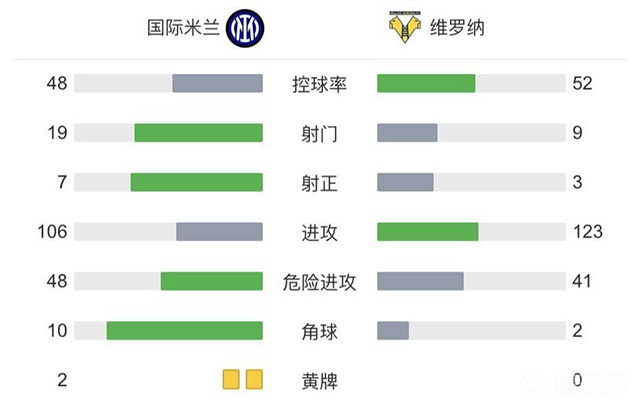 第22分钟,国米取得领先,佩里西奇左路带球推进后送出精准传中球,巴雷拉跟上弹射破门,国米1-0领先维罗纳。