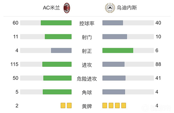 全场比赛结束,AC米兰1-1乌迪内斯。