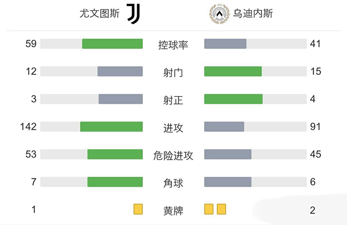 全场比赛结束,尤文图斯主场2-0战胜乌迪内斯。