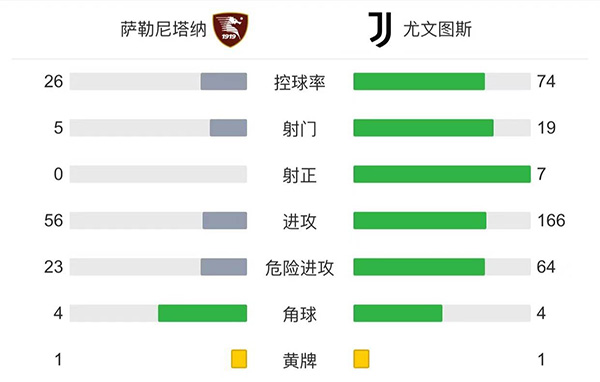 全场比赛结束,萨勒尼塔纳0-2尤文图斯。