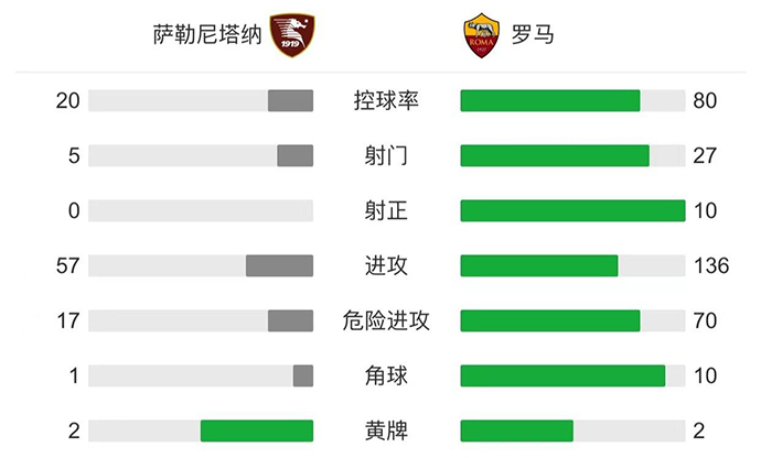 第90+2分钟,克里斯坦特禁区内得球后,晃开角度后起脚打门,球被挡了一下后再被门将没收。全场比赛结束,罗马4-0萨勒尼塔纳。