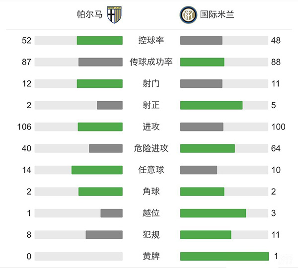 最终全场比赛结束,国米客场2-1战胜帕尔马,迎来联赛6连胜。