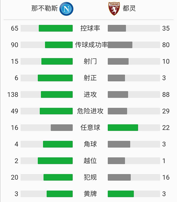 第92分钟那不勒斯扳平比分,因西涅左路得球直接弧线球射门得分,那不勒斯1-1都灵。