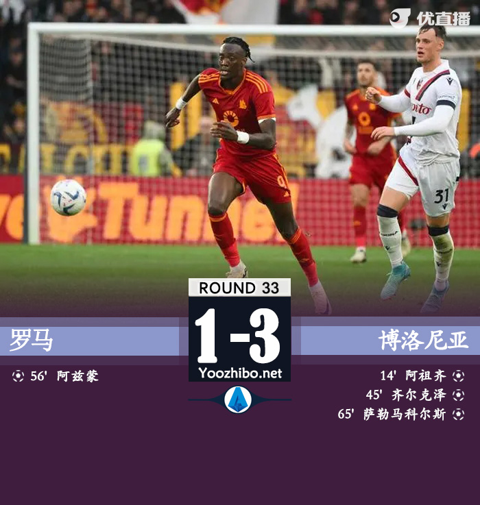 全场结束,罗马1-3不敌博洛尼亚。