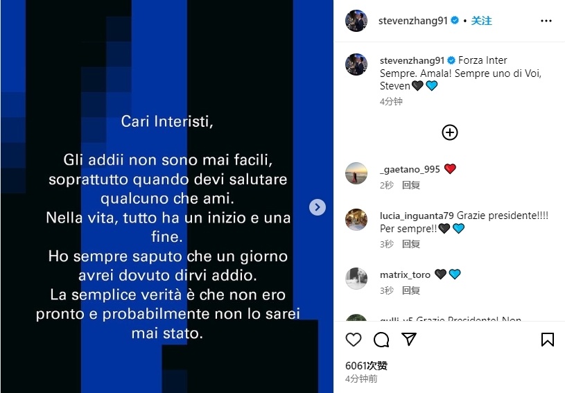 最后,张康阳感谢了过去3天那些给他发来信息、电话和帖子的人。他动情告别道:“我必须承认这让我感到被爱,但也使这次告别更加困难。感谢国际米兰,我找到了今天对我来说就像家人一样的人们,这将是我余生珍视的财富。”
