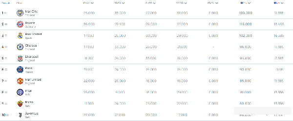 欧足联新一期欧战积分排名前10的球队分别为:
