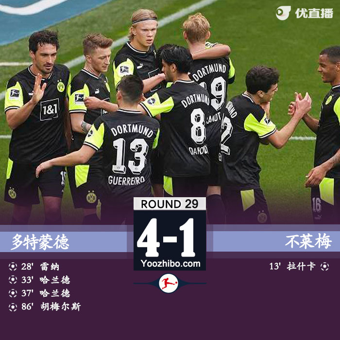 24直播网4月18日讯 北京时间4月18日晚上21:30,2020-21赛季德甲第29轮,多特蒙德坐镇主场迎战不莱梅。上半场,拉希察单刀破门,雷纳爆射扳平比分,罗伊斯造点哈兰德主罚命中,哈兰德推空门得手。半场战罢,多特蒙德暂3-1不莱梅。下半场,罗伊斯屡造险,埃格斯泰因中柱,哈兰德头球破门越位,塞拉西乌龙。全场比赛结束,多特蒙德4-1不莱梅,本赛季双杀对手的同时,距欧冠区4分。