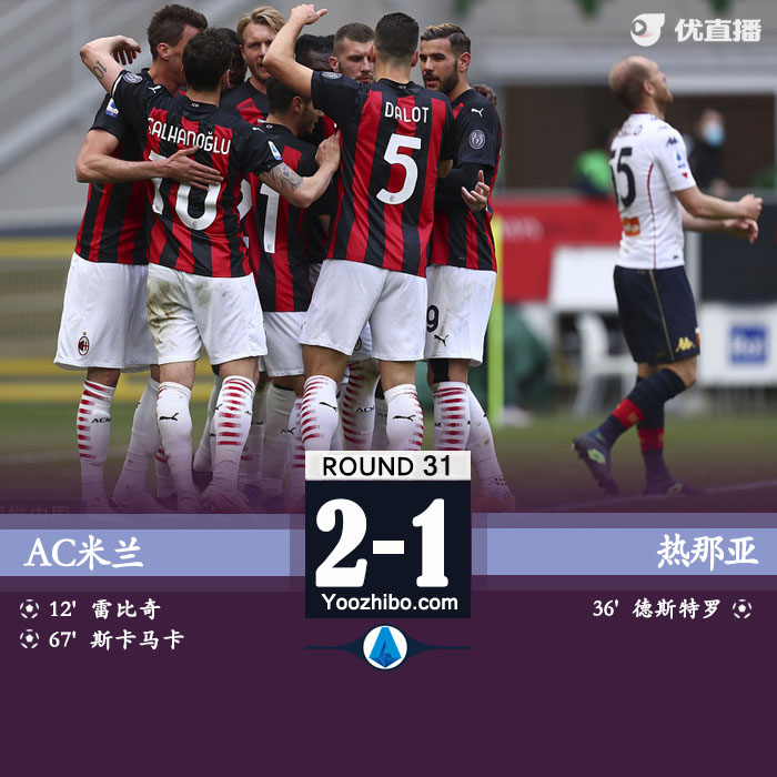 24直播网4月18日讯 北京时间4月18日晚18点30分,2020-21赛季意甲第31轮在圣西罗球场展开角逐,AC米兰坐镇主场迎战热那亚。上半场雷比奇凌空斩,德斯特罗头球扳平,下半场雷比奇失良机,斯卡马卡自摆乌龙,克亚尔和托莫里门线救险。最终AC米兰主场2-1战胜热那亚,米兰取得联赛两连胜。积分榜方面,米兰积66分落后国米8分,位居第2名。