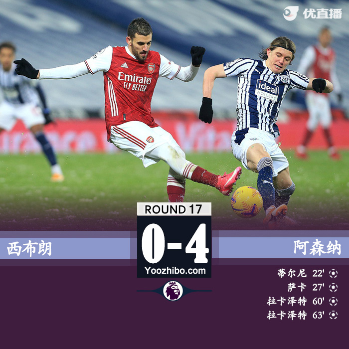 24直播网1月3日讯 北京时间1月3日04:00,英超第17轮继续进行,阿森纳客场挑战西布朗。上半场,蒂尔尼右脚兜射先下一城,史密斯-罗助攻萨卡推射空门扩大比分,下半场,拉卡泽特四分钟内完成双响。最终,阿森纳客场4-0大胜西布朗,取得三连胜升至第11位。