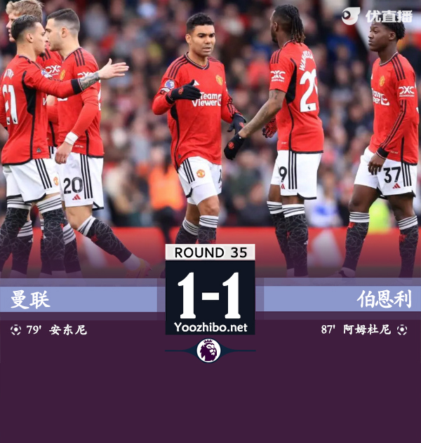 24直播网讯:北京时间4月27日,英超第35轮,曼联主场迎战伯恩利。上半场,B费小角度爆射中柱,奥纳纳贡献神扑+拒单刀。易边再战,安东尼屡失良机后破门收获个人赛季英超首球,奥纳纳送点阿姆杜尼点射扳平,麦克托米奈伤退。最终曼联1-1伯恩利。积分榜方面,曼联54分仍第六多赛两场距第五热刺6分,伯恩利24分仍倒数第二。