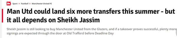 格雷泽家族正在考虑出售俱乐部,如果能很快做出决定,并且让谢赫贾西姆成为新老板,曼联可以通过清理过去积累的债务,为俱乐部提供额外的5000万英镑转会预算。此外,曼联希望通过球员销售筹集到1亿英镑,出售球员获得的资金,也可以进一步增加了俱乐部的转会预算。