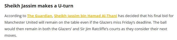谢赫贾西姆被指已经直接与格雷泽家族进行了谈判,他的这次最新报价总额达到60亿英镑,但其中10亿是用作未来投资俱乐部的预算,不在格雷泽家族的考虑范围。有人私下声称,由于卡塔尔收购的出价没有实质性提高,因此没有成功。同时,英力士的拉爵被认为仍然是成功收购曼联的热门。