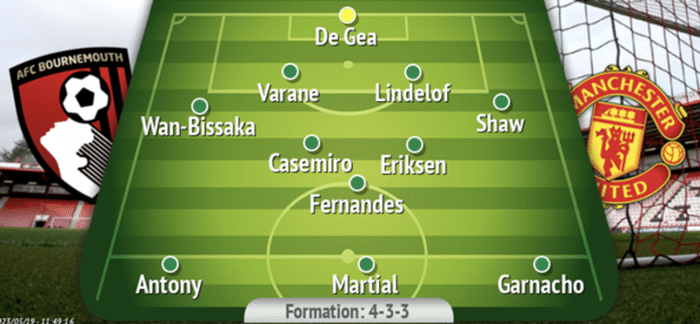 预测曼联对伯恩茅斯首发:德赫亚/万比萨卡,瓦拉内,林德勒夫,卢克·肖/卡塞米罗,埃里克森,布鲁诺·费尔南德斯/安东尼,马夏尔,亚历杭德罗·加纳乔。
