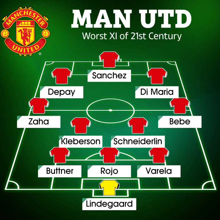 《太阳报》曼联世纪水货阵容:林德高/瓦雷拉,罗霍,布特纳/克莱伯森,施奈德林/贝贝,迪马利亚,德佩,扎哈/桑切斯。