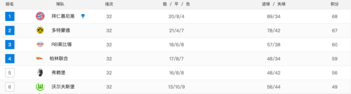 最激烈的莫过于德甲联赛,32轮过后领头羊拜仁和第2名的多特蒙德只差了1分。未来2轮拜仁将先后迎战莱比锡红牛(主)和科隆(客),拜仁只有全胜才能确保实现卫冕。而多特蒙德要想夺冠,除了寄望于莱比锡红牛能为了欧冠资格帮助他们至少打平拜仁之外,还要力争在剩余2场与奥格斯堡和美因茨的比赛中取得全胜。