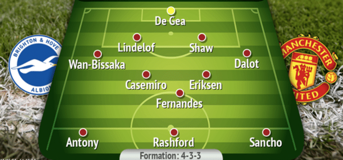 《曼彻斯特晚报》预测曼联对布莱顿首发:德赫亚/万比萨卡,林德勒夫,卢克·肖,迪奥古·达洛/卡塞米罗,埃里克森,布鲁诺·费尔南德斯/安东尼,拉什福德,桑乔。