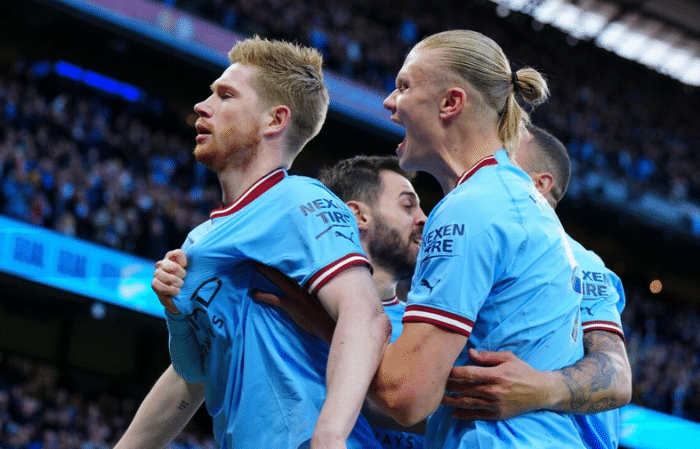 比赛第7分钟,曼城发挥了主场优势,快速进入状态,哈兰德助攻德布劳内破门,曼城1-0领先;比赛第45+1分钟,德布劳内主罚前场定位球,直接助攻斯通斯头球破门,曼城2-0领先;比赛第54分钟,哈兰德在快攻过程中分球,助攻德布劳内完成破门,曼城3-0领先;比赛第86分钟,特罗萨德助攻霍尔丁破门,阿森纳追回一球;比赛第90+5分钟,替补登场的福登助攻哈兰德完成推射破门,曼城4-1拿下比赛。