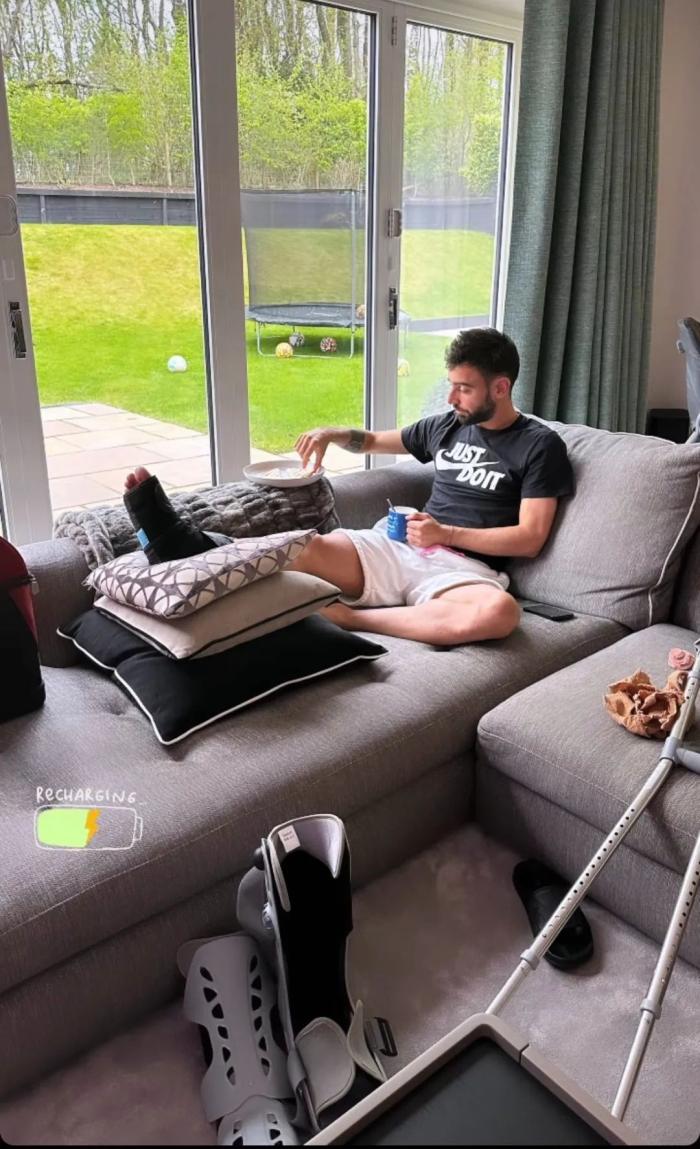 下场后的B费马上敷上了冰袋,这意味着其脚踝有肿胀,需要消肿后才能检查确定伤情。周一,其妻安娜·皮尼奥拍摄了一张丈夫戴着护具坐在沙发上的照片,旁边放着拐杖和保护靴,这让他参加与热刺的比赛变得几乎没可能。