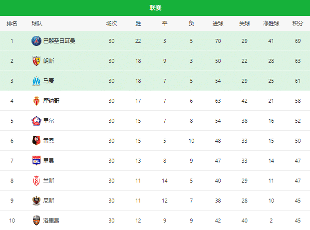 法甲的大巴黎虽然领先优势只有6分,30轮之后积69分,但联想到他们已经在欧冠、法国杯等赛事出局,接下来可以专心于联赛,所以被认为很有可能在接下来的8轮联赛中逐渐扩大优势,卫冕法甲冠军。