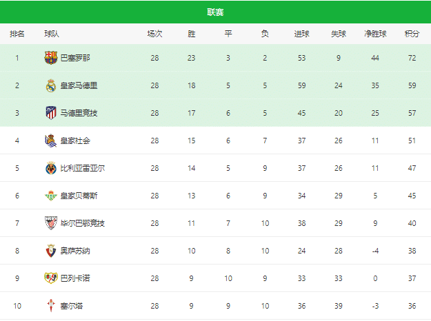 西甲的巴萨和皇马依旧是争冠主旋律,不过本赛季在联赛层面巴萨的表现更好,他们30轮过后只丢了9个球,防守很稳定。积分层面,巴萨72分,领先皇马13分,是很有可能提前加冕西甲冠军,哈维迎来自己执教巴萨以来的首个西甲冠军。