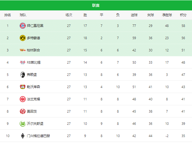 德甲的拜仁27轮之后58分,多特蒙德56分,双方的差距很小,柏林联合51分也有机会。拜仁本赛季的变动很大,糟糕的战绩使得纳帅下课,多特蒙德一度排名榜首,不过在正面对决中,拜仁4-2击败多特,重返榜首。剩余7轮联赛,两队不会碰面,就看谁可以把握住机会,争取连胜和不掉链子。