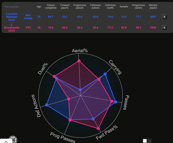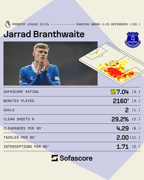 据称,埃弗顿可能会为这名主力中卫索要超过7500万~8000万英镑的转会费,但曼联希望以大约5000万英镑的价格收购。数据显示,布兰斯韦特是传统的英格兰中后卫,他在场均铲球、解围、断球、头球和犯规上的数据都胜过利桑德罗·马丁内斯,但传球远不如利马。本赛季,布兰斯韦特在25场英超中,还取得2个进球。