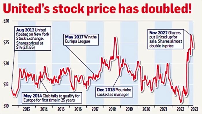 虽然收购出现波折,但曼联在纽交所的股价周五仍然达到25美元的峰值。其开盘后一度暴跌1美元,但下午重新飙升。过去一周,曼联的股价一度超过了26美元,上涨6%,这可能增强格雷泽家族想要至少60亿英镑的决心。