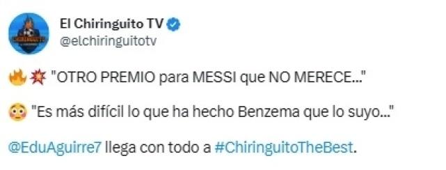 C罗好友、西班牙六台记者阿吉莱尔(Edu Aguirre)就在社交媒体上提出了质疑。他直言道:“这又是一个梅西不配拿的奖。本泽马做到的事情要比梅西更难。”显然在阿吉莱尔看来,本泽马过去1年的综合表现、所获得的荣誉都要比梅西更适合当选FIFA年度最佳球员。