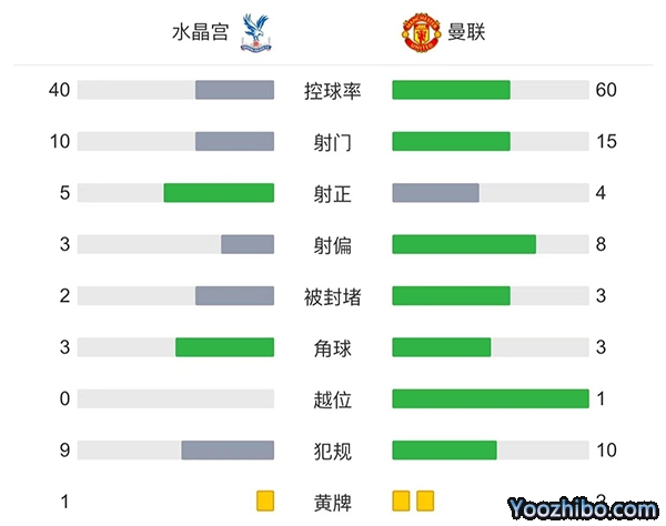 下半场补时6分钟,最终曼联1-1水晶宫,各项赛事九连胜被终结。