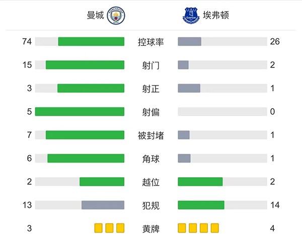 全场比赛结束,最终曼城1-1战平埃弗顿。