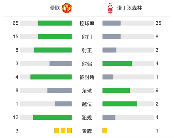 全场比赛结束,最终曼联主场3-0完胜诺丁汉森林!