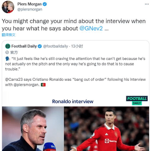 因为C罗完整版的采访还没有出来,外界总有一些捕风捉影的猜测和言论,摩根也在社交媒体上表示自己才是最权威的,一些C罗采访的谣言是不可信的。同时摩根还在节目中谈到了C罗采访的相关话题,也在社交媒体上进行预热,一时间,外界的关注度极高。