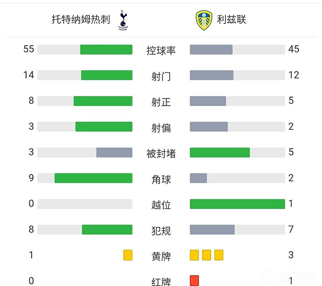 全场比赛结束,最终热刺三度扳平4-3逆转利兹联。